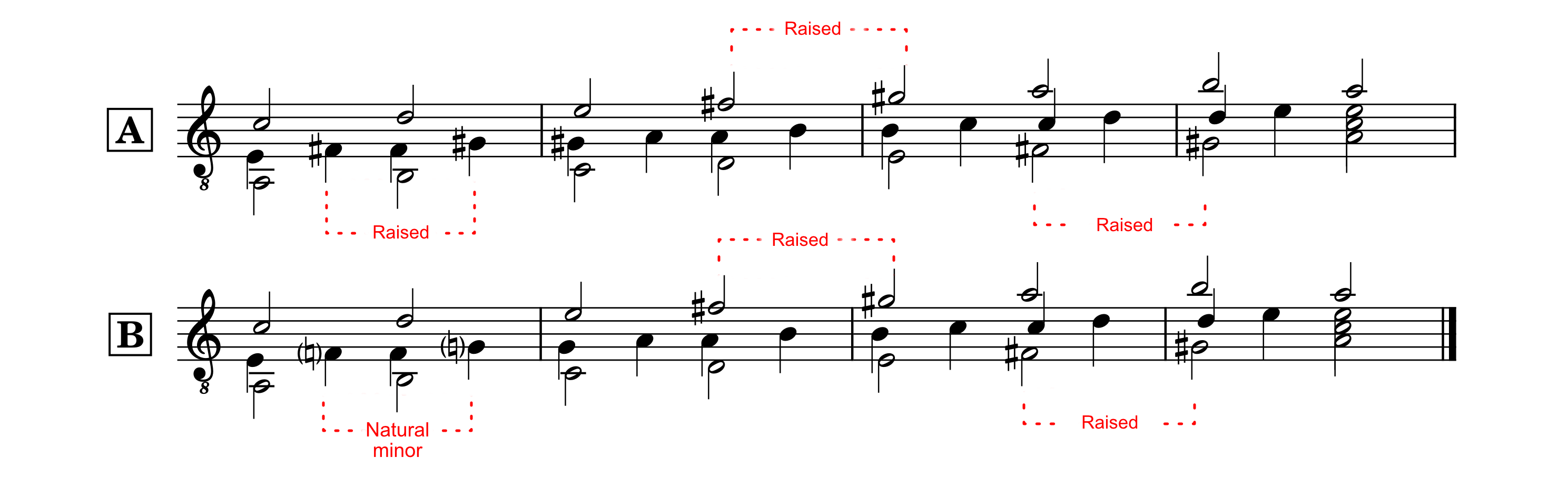 Fenaroli presents these contrapuntal motions exclusively within the major scales in the Partimenti ossia basso numerato. In contrast, the minor mode, as Job Ijzerman observes in Harmony, Counterpoint, Partimento, “requires some caution.” Ijzerman outlines two models for the minor mode: the first raises the sixth and seventh scale degrees in all voices, while the second employs the natural minor sixth and seventh on scale degrees ① and ②, but raises them on degree ④, ⑤, ⑥ and ⑦.
