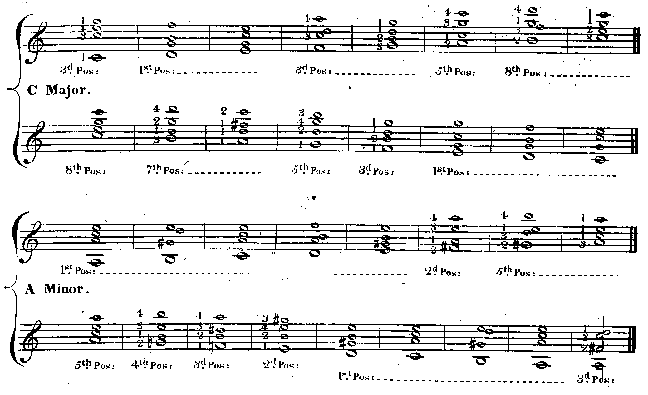 Around 1831-33 Louisa Kirkman published her Improved Method for the Guitar, designed to facilitate the progress of the pupil and to diminish the labour of the teacher containing a detalied overview of the RO in all of the 24 major and minor keys. In her method we find the inclusion of both the ascending and descending scale, and at the end of the descending minor scale a reharmonisation of the first scale degree with an added 7th is introduced to serve as a passing dominant, making a pleasant transition to the consecutive major key.