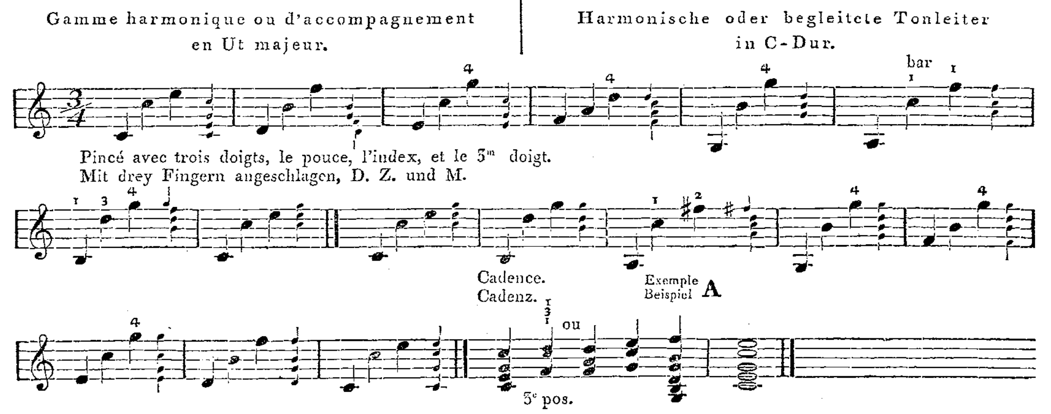 In the Scales of C major and A minor, one will find small notes written in all of the measures, which should not be plucked, but which are there only to indicate the whole harmony, proper to each given chord, as it was said in the general rule.