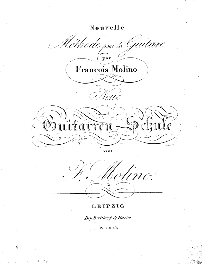 Molino’s guitar method is the last one we shall look at in this article. The method, which is in both french and german, is quite thorought with an introduction to the principles of music and basic playing instructions. A big emphasis is put on arpeggios and accompaniment. On page 35 he writes: