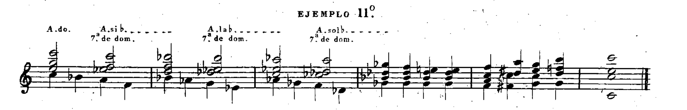 El bajo del ejemplo 10o puede variarse como se ve en el ejemplo 11o que desde el 4 compás hace una modulación que le vuelve al tono primitivo sin seguir todos los acordes del anterior, porque rara vez se ofrece hacer una serie tan larga de cadencias evitadas.