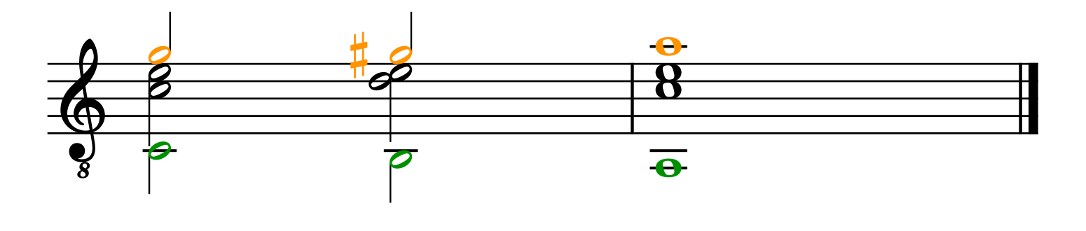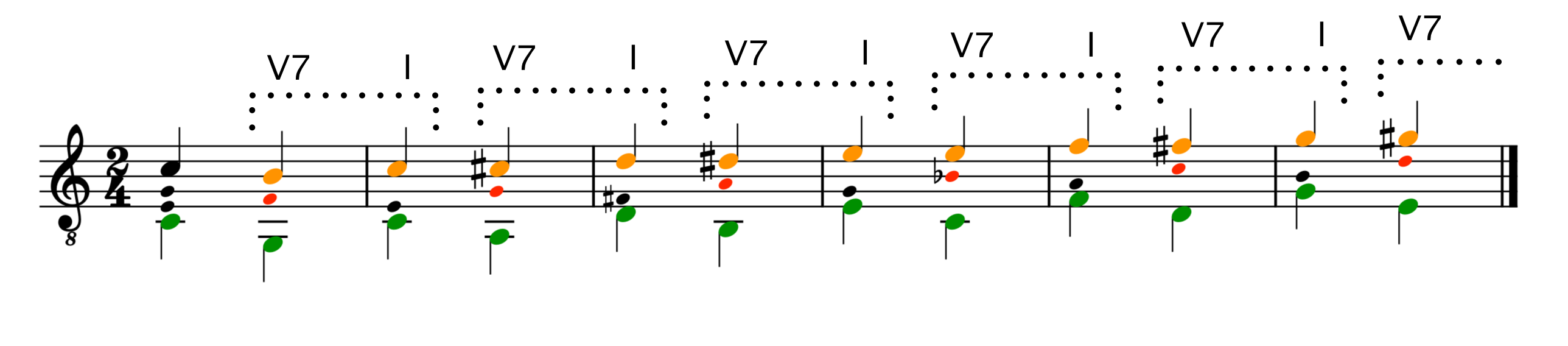 In ex. 2.2.1 the top chromatic voice is colored orange, and the fundamental bass is green. The two first chords works as a starting point for the motion, and on the third bar a sequence of V7 to I starts. The chromatic soprano voice alters between being the 7th and the 3rd in the chords.