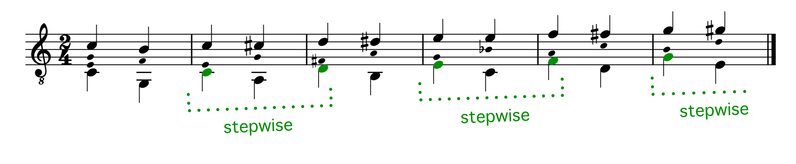 An alternative way of looking at this motion is to think of it as stepwise every other step in the bass. In ex. 3.1.3 we can see that the bass on the accented beat has an ascending stepwise motion. The same is true for the unaccented beat (ex. 3.1.4), which also has a stepwise motion.