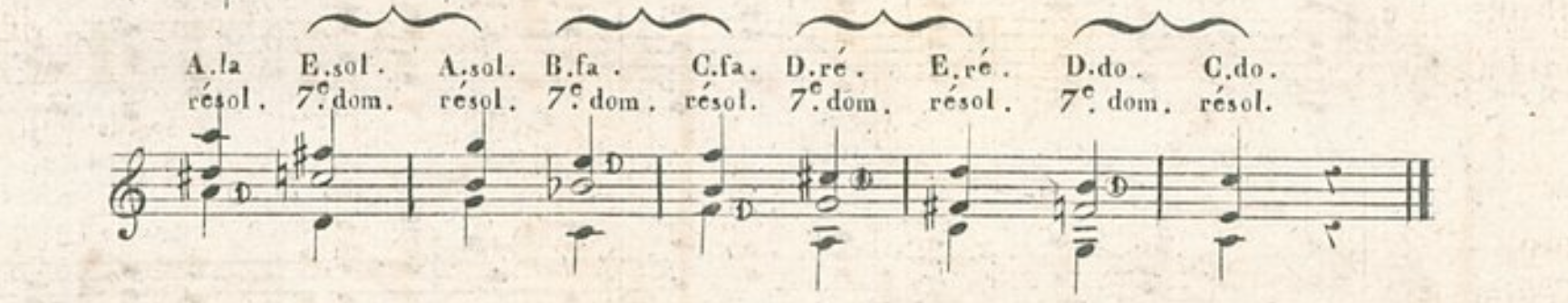 Con este andamento de bajo se puede pasar por los 24 tonos de la escala enlazando los mayores con sus relativos menores. Al bajo fundamental se sustituye un bajo cantante, que desciende de medio tono, luego de un tono, para ir de mayor á menor; y dos veces de un tono para ir de menor á mayor.