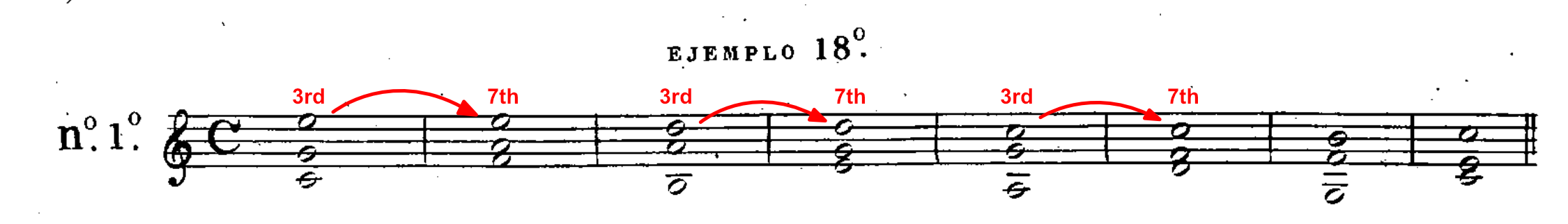 En la Ia variación ( Ej. 18°no 2 ) todas las notas del bajo cantante, que se mueve por saltos, son parte del acorde: en la segunda variación (no 3) en que se mueve de grado, las que no son parte del acorde se toleran por hallarse entre dos que están en armonía. Esta regla es general .